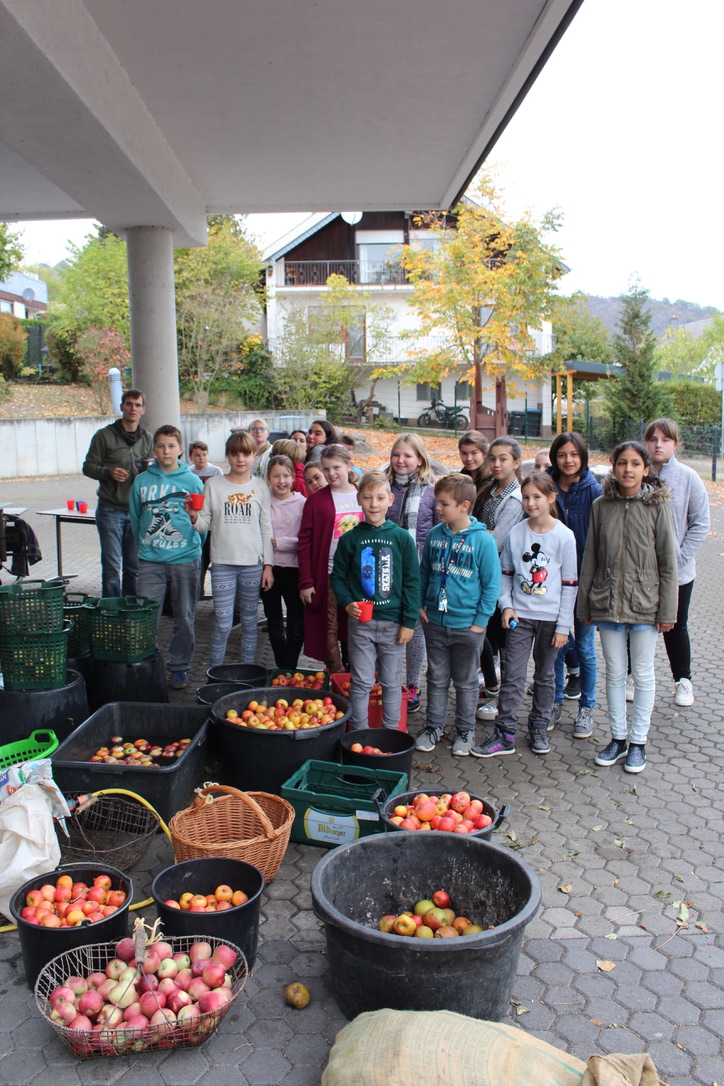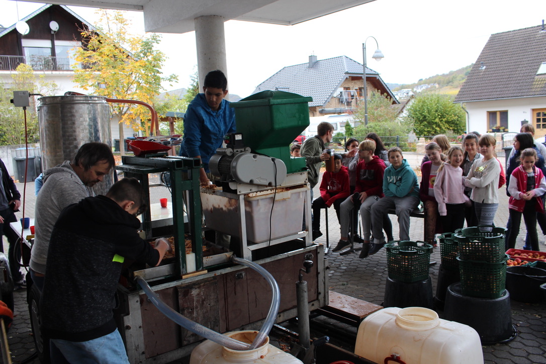 Einen sehr süßen Beigeschmack hatte der Schulunterricht an der Realschule plus und FOS Untermosel, als dort auf dem Schulhof für die Dauer eines ganzes Schultages eine erfolgreiche Apfelsaftproduktion in Betrieb ging.