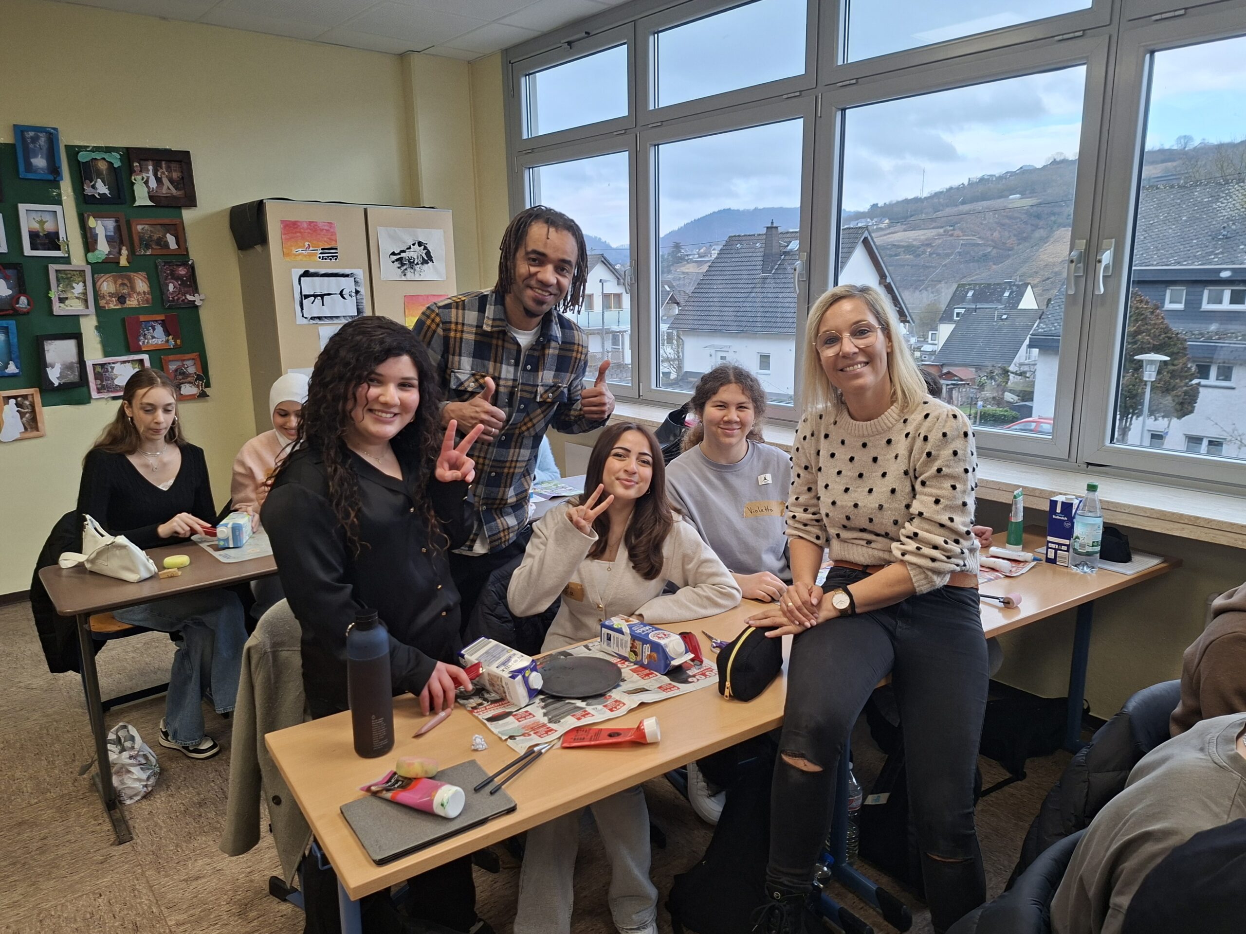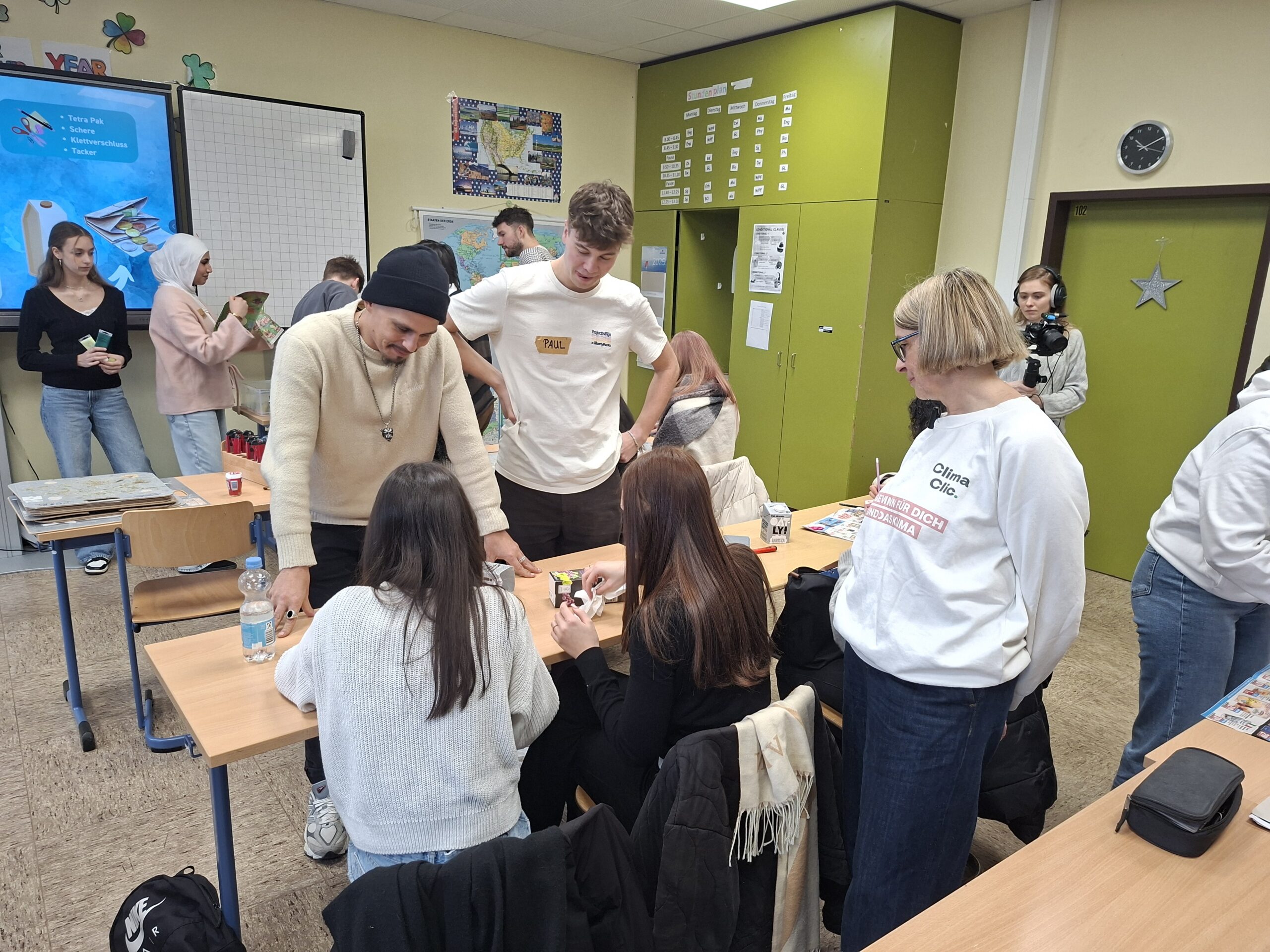 Der Höhepunkt dieser beiden Tage stellte der Besuch von Marc Helwing als Gründer der Umweltschutzorganisation project wings und Johnny Strange und Don Cali von der Musikband Culcha Candela dar. Seit 2019 führt project wings die unterschiedlichsten Umweltschutzprojekte und Workshops an der Schule durch. Da Culcha Candela seit Juni 2021 offiziell zu den Schirmherr*innen von Project Wings gehört und Johnny selbst den Verein „Afrika Rise e.V.“ gegründet hat, unterstützt die Musikband aktiv die Umweltbildung an deutschen Schulen und im aktuellen Fall die Umweltbildung an der RS plus Untermosel. Dieses Mal wurde zum einen mit einer 10.Klasse Plastikmüll im Meer thematisiert und damit verbunden ein Upcycling durchgeführt. Zum anderen hatte die Wirtschaftsklasse 11 ein Interview für unsere Gäste vorbereitet, bei diesem nicht nur die eben genannten Gäste sondern auch weitere Gäste von ClimaClic befragt wurden. ClimaClic ist die einzige deutsche Umweltlotterie, die mit jedem verkauften Los gemeinnützige Partner mit geprüften Klimaschutzprojekten, wie beispielsweise auch project wings, unterstützt.