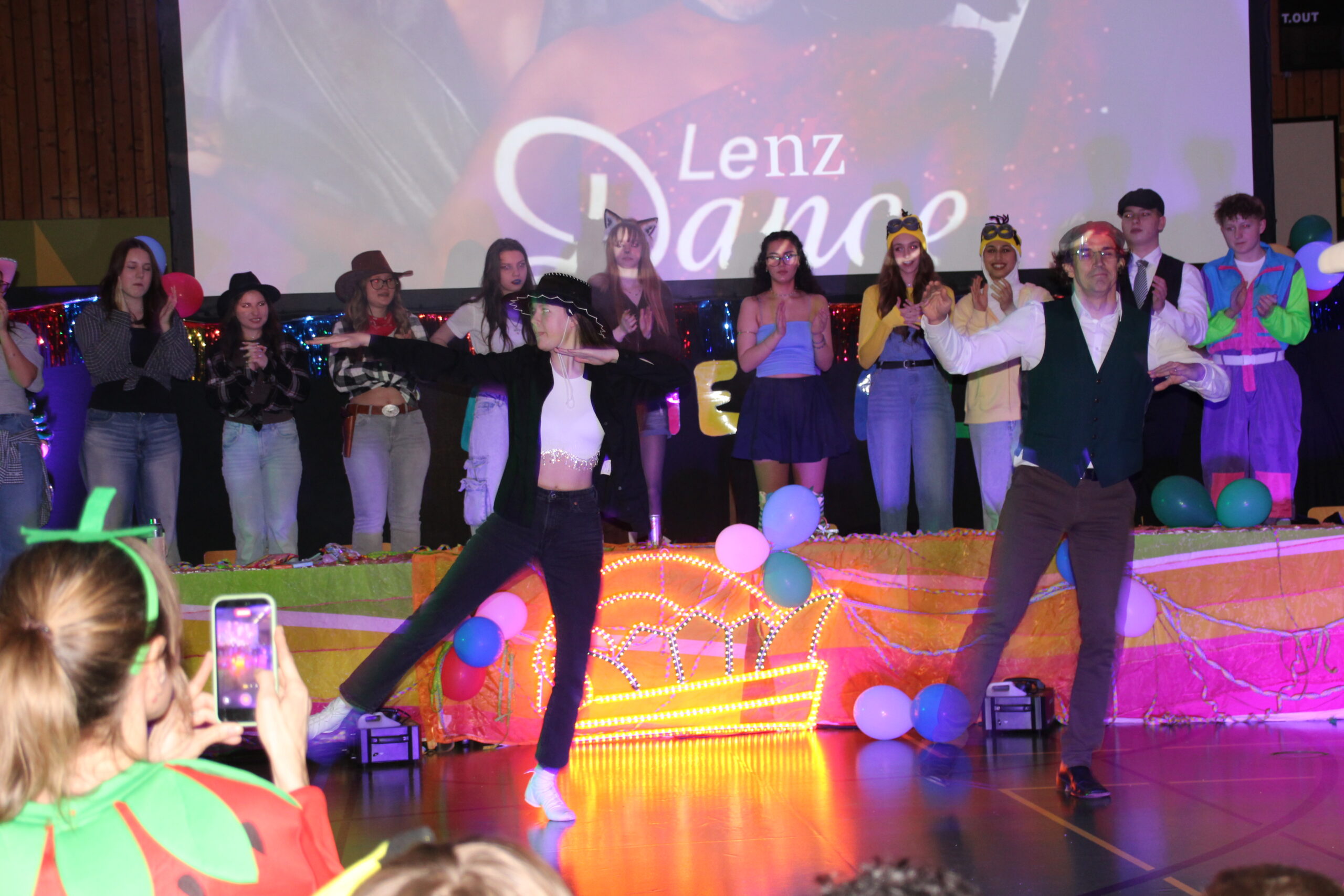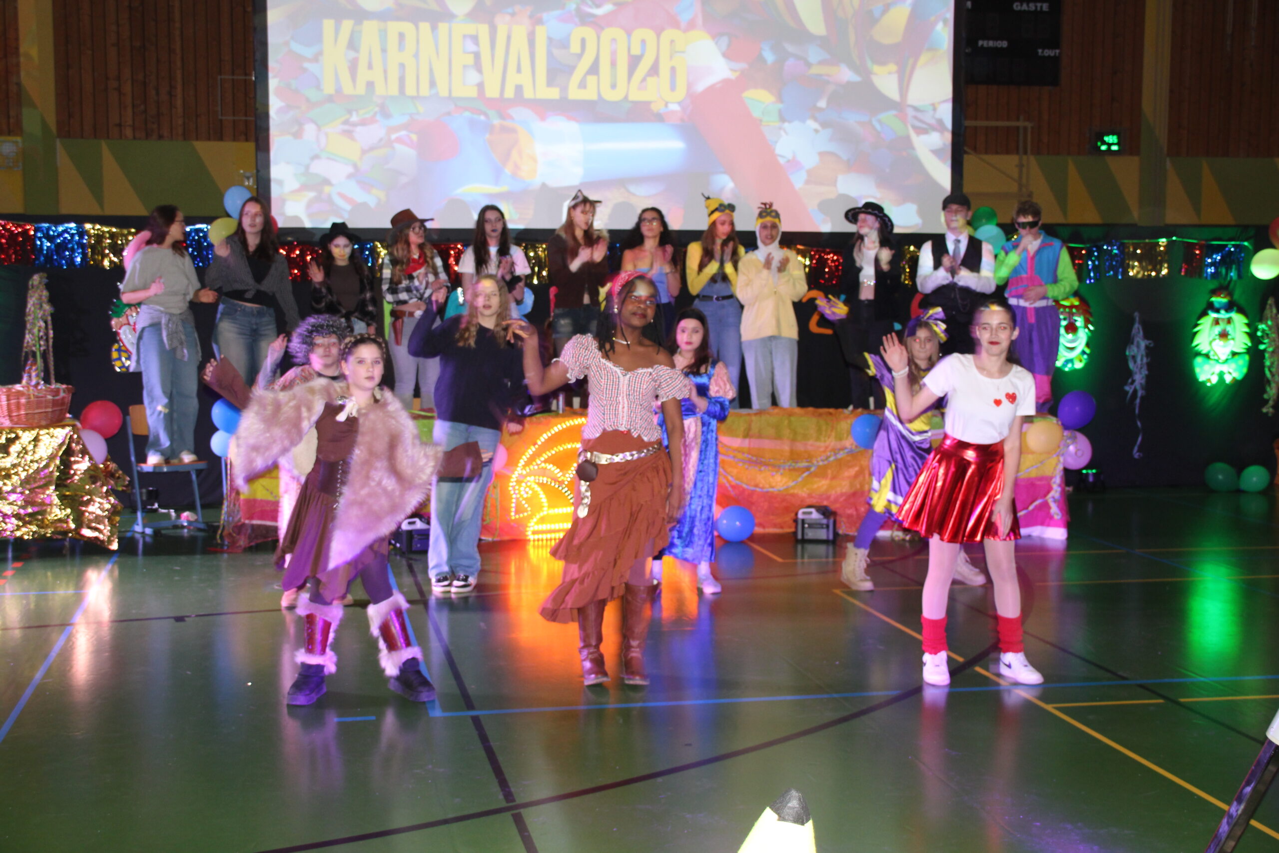 Ein dreifach donnerndes, fröhliches Karnevalshelau erlebte die närrische Schulgemeinschaft für zwei jecke Schulstunden in der Turnhalle der Schule. Nach Katja Schmelzers Eröffnung in Reimen wurde anschließend unter der Moderation der Schulsprecherinnen Vyan Marko und Paula Rogala geschunkelt und gefeiert. Die schulischen Narren erlebten Tänze, Gesang, Sketche, Wettspiele der Lehrer- und Schülerschaft und schließlich einen Wettbewerb zu den prächtigen Kostümierungen der Schüler und Schülerinnen, den Ilias Riethmüller als sehr origineller Hotdog- Verkäufer gewann. Aber auch viele närrisch herausgeputzten Lehrer und Lehrerinnen konnten sich übrigens durchaus sehen lassen !