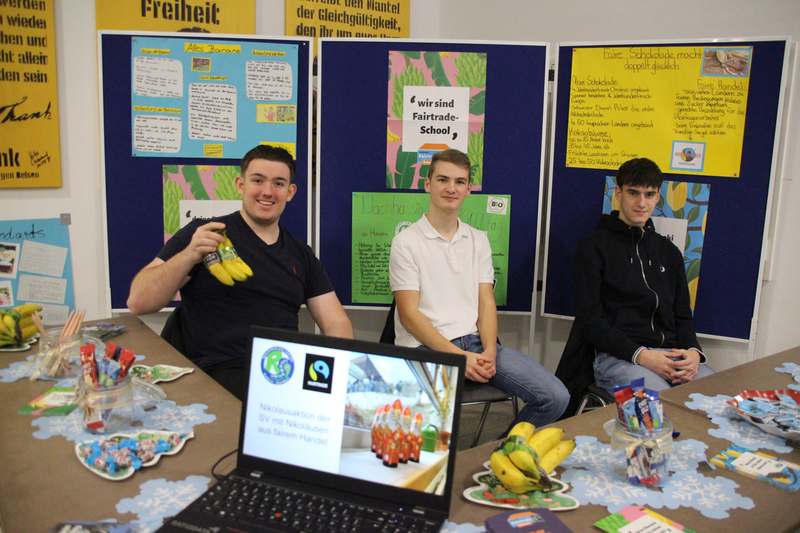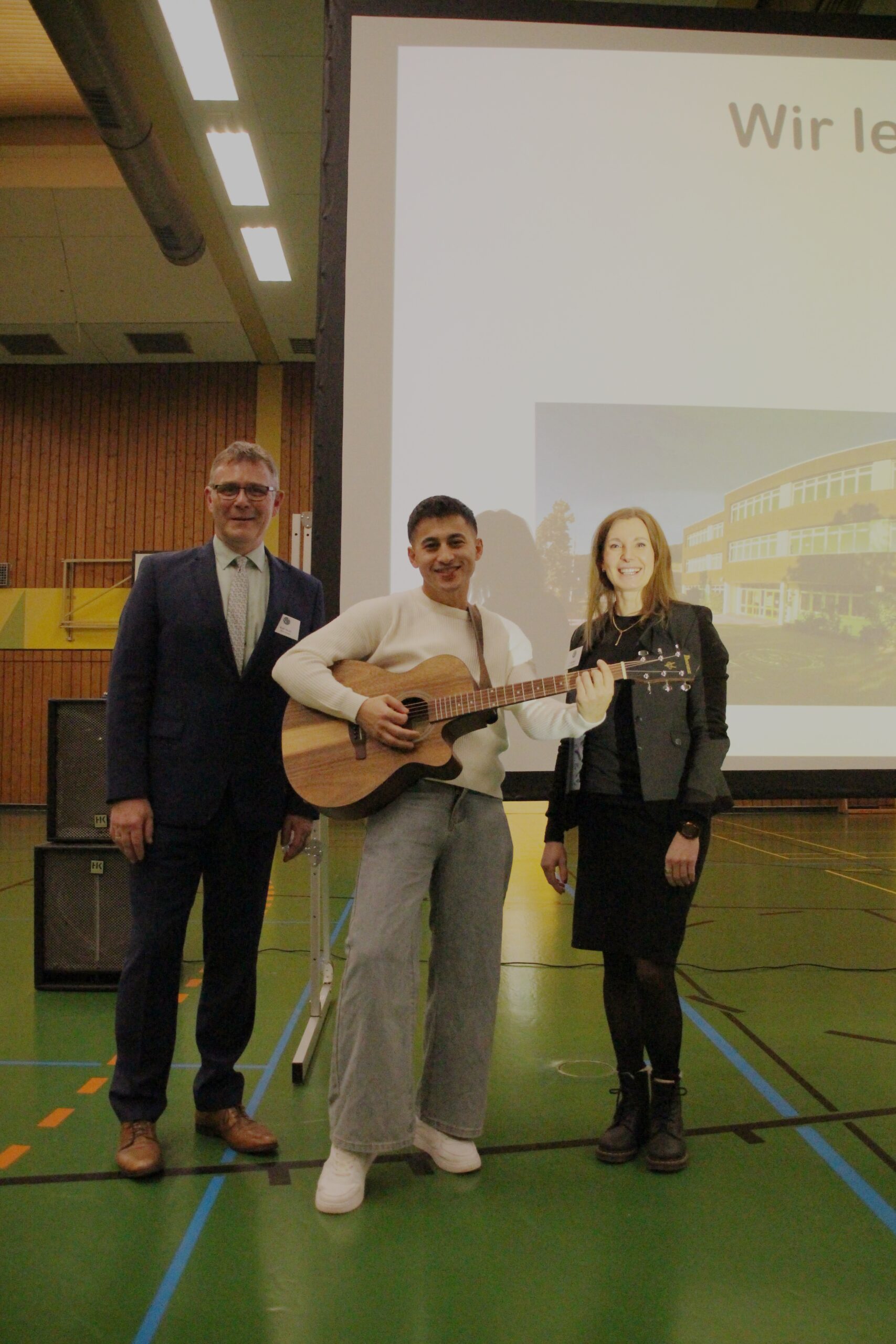 Schulleiter Ralf Heuft und die didaktische Koodinatorin Julia Mohr freuten sich über den Auftritt des früheren Schulabsolventen Abi Faizan.