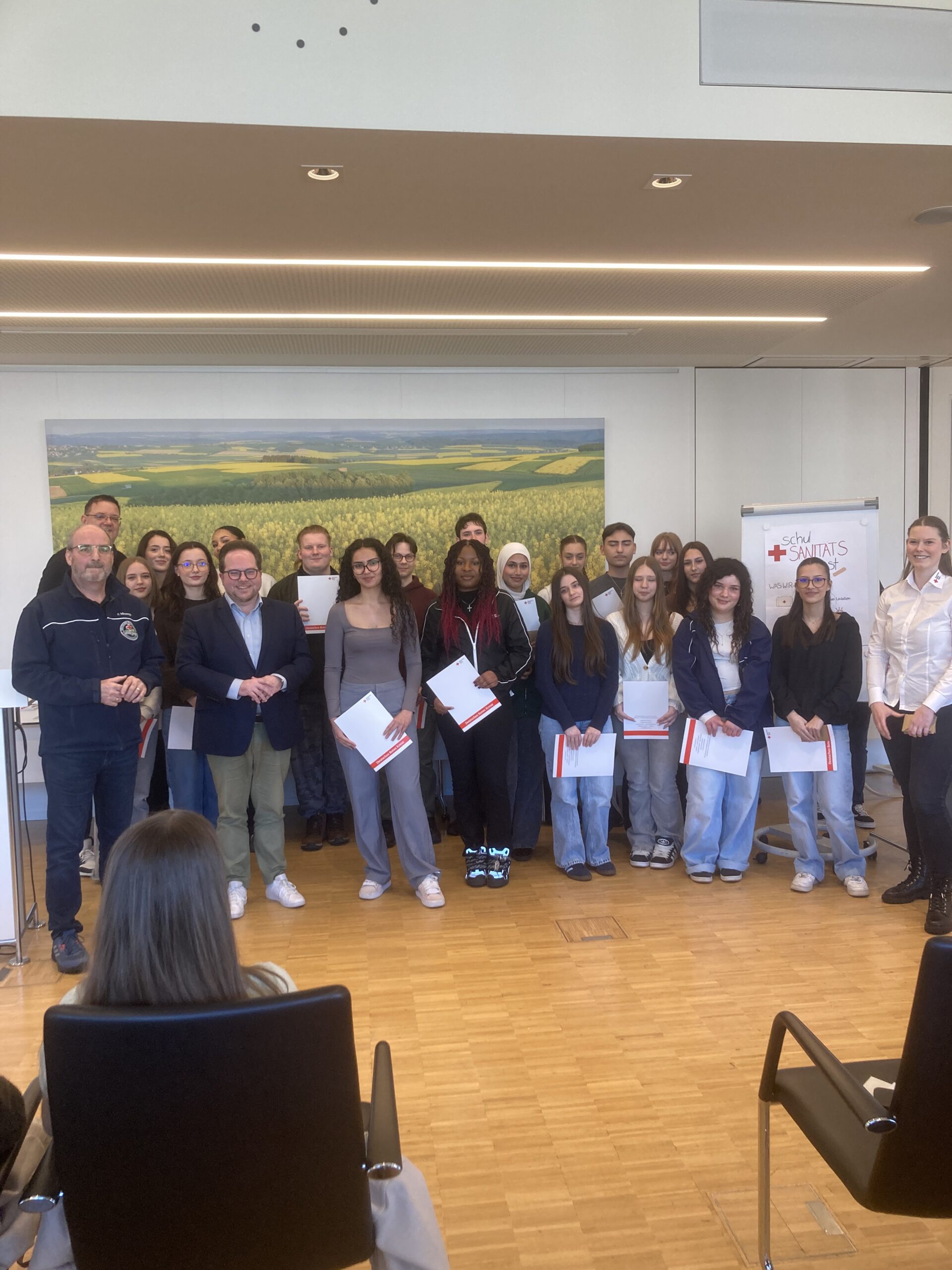 Sie folgten, zusammen mit ihrem betreuenden Lehrer Herr Jens Müller, der Einladung des Landrats ins Kreishaus nach Koblenz. Dort erhielten sie in Anwesenheit des Beigeordneten Pascal Badziong und Mitgliedern des DRK eine Urkunde und ein Präsent des DRK.